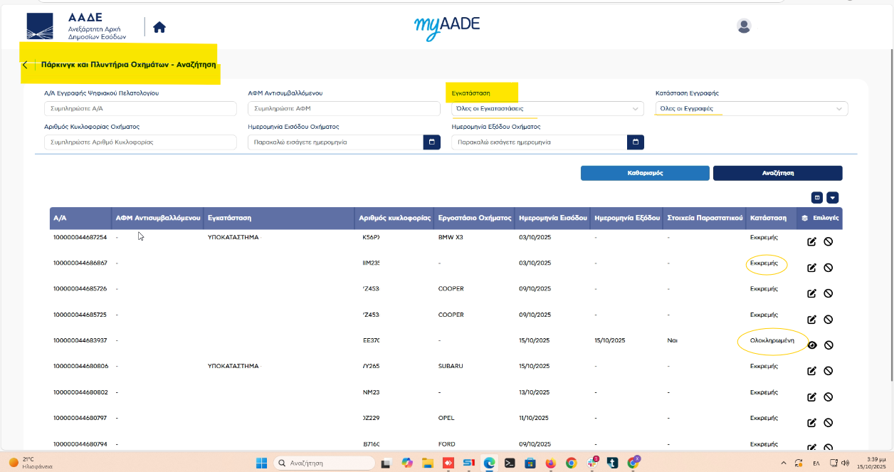 - Κατάσταση Εγγραφής (Εκκρεμής ή Ολοκληρωμένη)